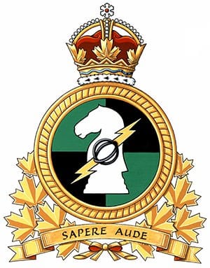 "The badge reflects CAFCYBERCOM’s mandate to defend CAF networks, carry out cyber operations, and support CAF operations at home and abroad. Its design symbolizes strategic agility, technical precision, and service to Canada. The green and black field reflects the Command’s integration of signals intelligence, electronic warfare, and cyber operations across the digital and electromagnetic domains. The green represents signals intelligence heritage, while the black represents electronic warfare and operations within the contested electromagnetic spectrum. The chess knight represents the deliberate application of cyber capabilities in both defensive and offensive contexts. A lightning bolt and interlaced rings highlight operational precision and expertise in signals intelligence, while the Royal Crown and maple leaves affirm constitutional authority and national service. The Command’s motto, Sapere Aude, “dare to know”, underscores the intellectual rigour and professional discipline required to operate in a contested digital and electromagnetic environment."
