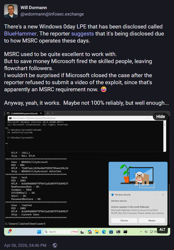 Exploit code published for BlueHammer zero-day: A disgruntled security researcher has published proof-of-concept code for a Windows zero-day. Named BlueHammer, the zero-day can be used to elevate privileges on Windows. The researcher released the exploit code after what appears to have been a disagreement with the Microsoft Security Researcher Center, the Microsoft team that handles the company's bug bounty program.
