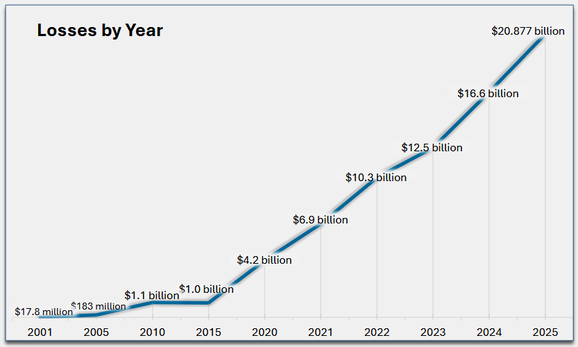 Americans have lost almost $21 billion to cybercrime last year, more than any other since the FBI began tracking cybercrime data 25 years ago, the FBI said in its yearly Internet Crime Report [PDF].