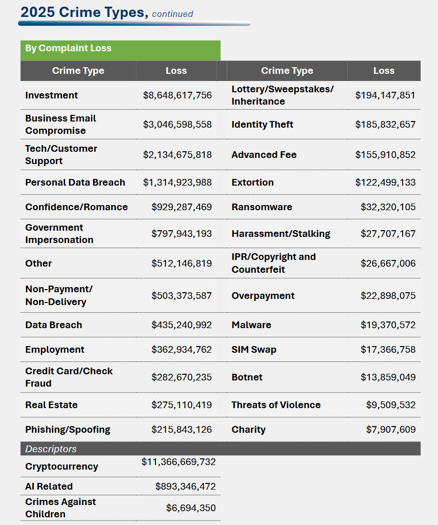 Investment scams were again the top category in terms of losses, with $8.6 billion reported stolen, and almost $6.2 billion of that sum being stolen as cryptocurrency.