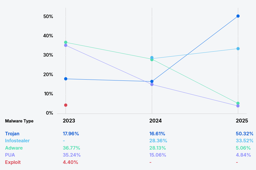 RATs and infostealers dominate macOS malware trends: Infostealers and remote access trojans accounted for almost 85% of all macOS malware detections last year. The number has skyrocketed from only 17% two years before. The change is a direct result of multiple turnkey macOS infostealers being broadly available on hacking forums since 2023. [Jamf]