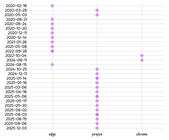 GhostPoster size doubles: Back in December, Koi Security discovered GhostPoster, a network of 17 malicious Firefox extensions . LayerX says it found an additional cluster of 17 more extensions , these ones also impacting Chrome and Edge. These new ones have an install base of over 840,000 users and some of them date back to 2020.