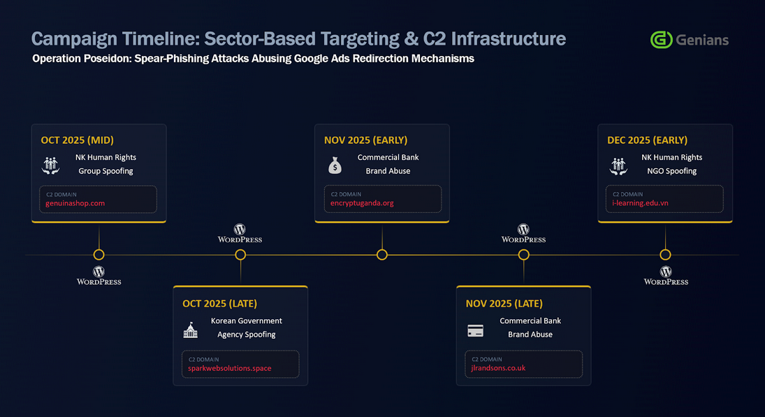 Operation Poseidon: A North Korean APT group has used advertising-related URLs to hide malicious URLs and bypass email security filters. The campaign used Naver and Google DoubleClick domain redirection features to redirect links inside emails to malicious domains. South Korean security firm Genians linked the months-long spear-phishing campaign to a group known as Konni .