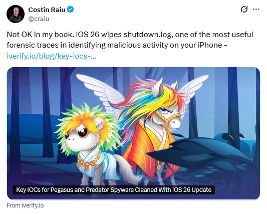 Now, with iOS 26 doing the wiping, it will be hard to find evidence of super-old Pegasus/Predator infections, and a clean shutdown.log file will be indistinguishable from normal iOS behavior.