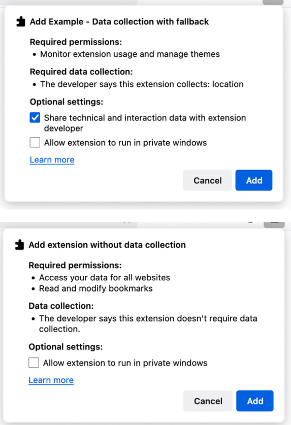 New Firefox data consent feature: Starting November 3, Mozilla will require all Firefox extensions to specifically declare in the manifest.json file if they collect and transmit personal data. This data will soon be integrated in Firefox permission prompts.