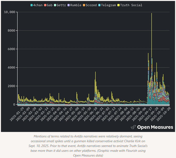 Antifa info-ops: OpenMeasures looks at info-ops campaigns that resurrected the topic of Antifa shortly after Charlie Kirk's assassination. Info-ops focusing on Antifa had been dormant since the last time Trump was in office.