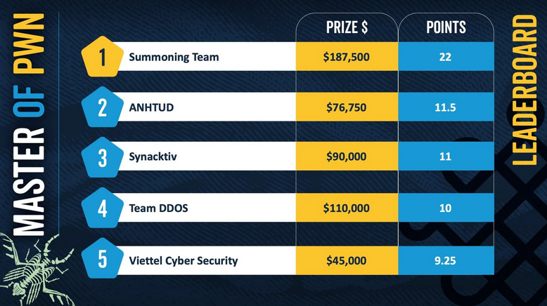 Pwn2Own Ireland results: The Summoning Team has won this year's edition of the Pwn2Own Ireland hacking contest. The results from days one , two , and three are linked. This year, researchers won $1,024,750 for 73 unique bugs.