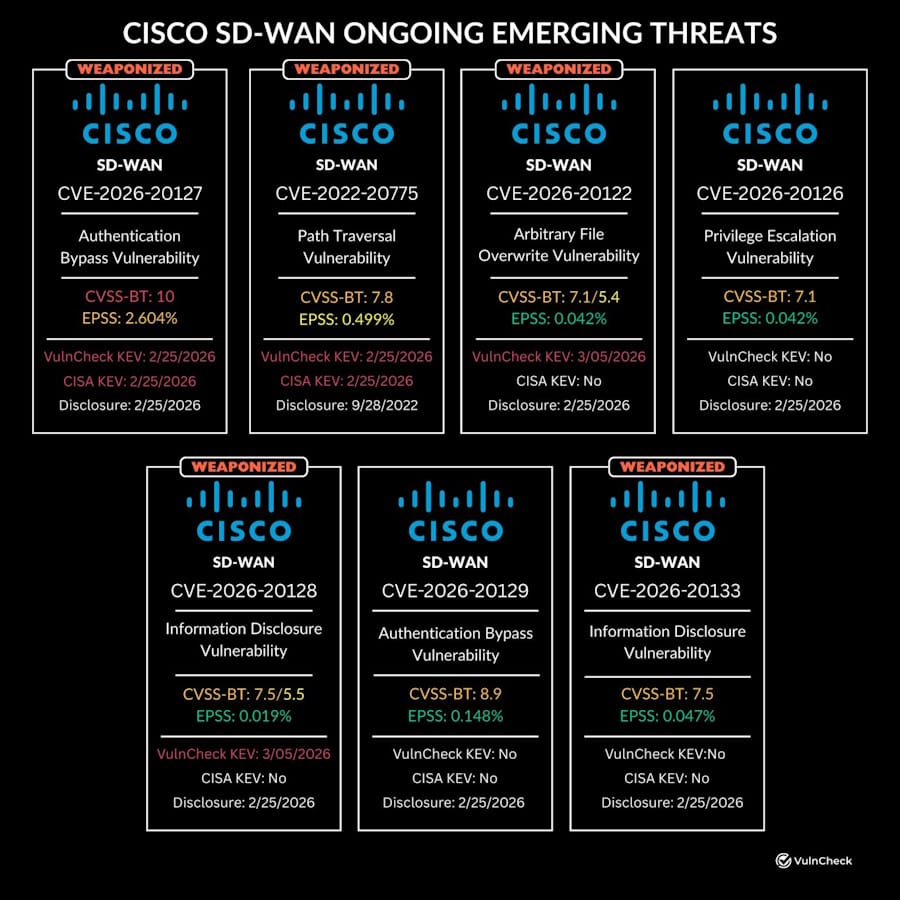 Additional Cisco SD-WAN exploitation: Security firm VulnCheck looks at the recent exploitation activity around Cisco's SD-WAN platform. Attacks have targeted three recent vulnerabilities, but VulnCheck says it expects a fourth bug (CVE-2026-20133) to come under attack pretty soon as well. [h/t Patrick Garrity]