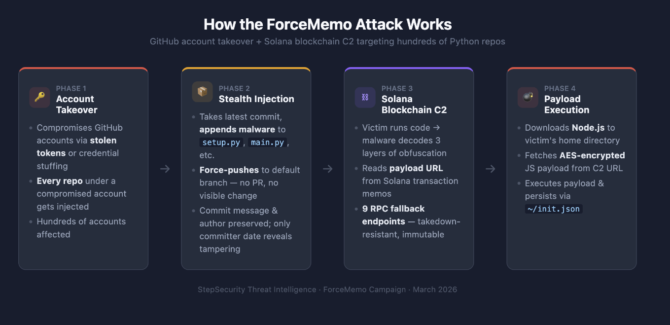ForcedMemo campaign hits GitHub: A threat actor has breached hundreds of GitHub accounts to inject malicious code in Python projects. The malicious code appears to be a crypto-wallet stealer. The hacks have been taking place since March 8. Step Security says the attackers are using Github credentials previously stolen by the GlassWorm self-replicating worm that hit the VSCode ecosystem last year. The campaign's infrastructure also uses old GlassWorm infrastructure.