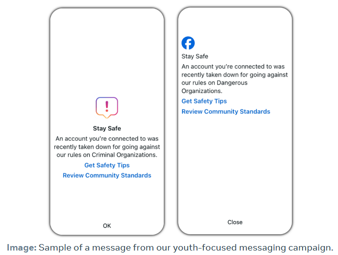 To combat these groups, Meta says it prompted youth in Mexico last year with a special message when they interact with the accounts, which later led to "a demonstrable increase in account deactivation and unfriending behavior." This alert was expanded towards the end of last year to other cartel hotbeds like Brazil, Colombia, and Haiti.