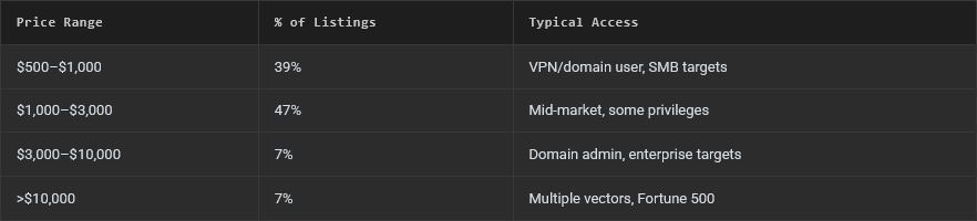 IAB market is now very affordable: The initial access broker market saw a dramatic shift toward affordability last year. The vast majority of hacked networks had prices of under $3,000, according to Abstract Security. Valid accounts without MFA was the most common initial access vector.