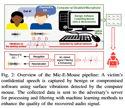 Mic-E-Mouse attack: Academics have developed a new technique that turns an optical mouse into a microphone to secretly record and exfiltrate data from air-gapped networks. The new Mic-E-Mouse technique takes advantage of the extremely powerful optical sensors that are now common in gaming mice. The optical sensors detect tiny vibrations caused by nearby sound and record the pattern in mouse movements. This data can be collected and then exfiltrated to recover conversations with the help of sound-processing LLMs.