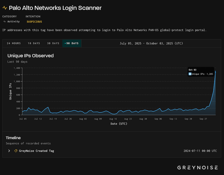 PAN scanning surges: At the same time, GreyNoise has also spotted a 500% surge in scans for Palo Alto Networks login panels. These types of surges typically predate active exploitation campaigns.