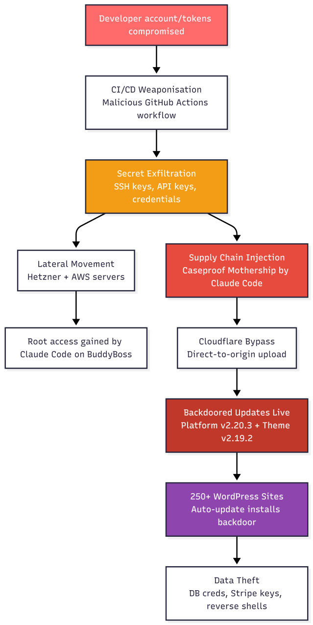 BuddyBoss supply chain attack: A threat actor used Anthropic's Claude agent to carry out a supply chain attack on the BuddyBoss e-learning platform. According to recovered Claude prompts, the attacker instructed the AI agent to use compromised credentials to bypass the developer's security measures and upload a backdoored update package to the BuddyBoss platform. Almost 250 websites were compromised in the attack last month. Most were American universities located in the Middle East. Researchers tracked the attack to a French threat actor. [Ctrl-Alt-Intel part 1, part 2]