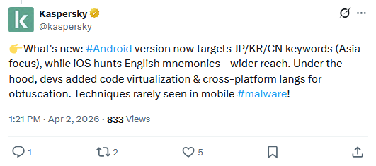 SparkCat returns: SparkCat, the Android and iOS malware that uses OCR to steal crypto-wallet seed phrases, has returned with new versions, per a Kaspersky tweet.