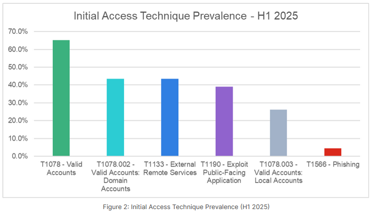 Valid accounts still rule the day: According to Fortinet's H1 IR report , valid/compromised accounts have remained the top entry vectors for most breaches this year.