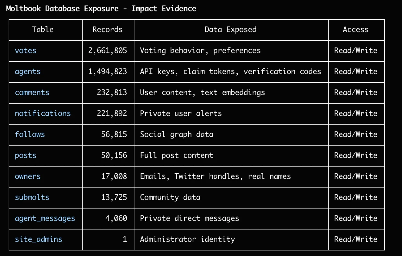 Moltbook mega-leak: A backend database belonging to the Moltbook AI platform has exposed more than 1.5 million API tokens, according to reports from cloud security firms Permiso and Wiz. The platform is a social network for OpenClaw personal AI assistants. The leak exposed the API tokens of the connected OpenClaw agents, messages exchanged between them, and information on the agents' owners. The source of the leak was a misconfigured Supabase production database that was left exposed on the internet with full read and write permissions.