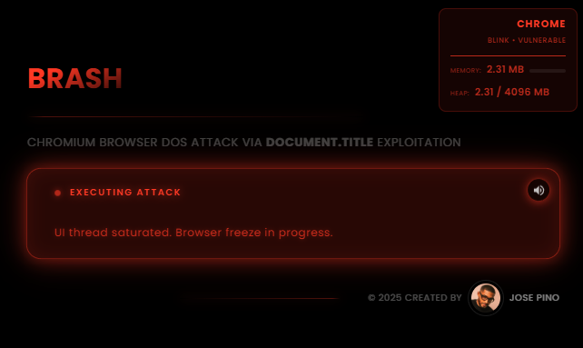 Brash attack: Security researcher Jose Pino has found a Blink engine bug that can crash Chromium-based browsers after roughly 15-60 seconds on a page. The bug is named Brash , and a demo page is here ( Careful! This may crash your browser, obviously!!! ).