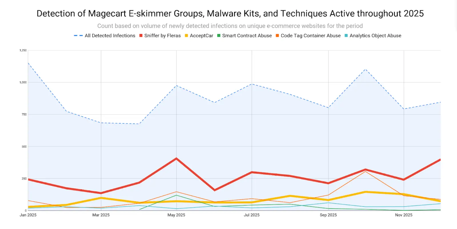 "Sniffer by Fleras" dominates skimmer market: More than 142 million stolen card details were posted online last year. While the number is smaller than the previous year, Recorded Future says the quality of the cards was far superior, putting more users at risk than usual. The company described the card fraud ecosystem as getting more industrialized, with several web skimmer kits now being broadly available on the market. One kit alone, named Sniffer by Fleras, was responsible for a quarter of all skimmer incidents.