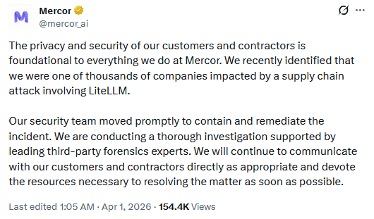 Mercor breach: AI hiring startup Mercor has disclosed a security breach caused by the supply chain attack on the LiteLLM Python library. The company says it contained the breach as soon as it discovered it. Mercor is valued at $10 billion. The company helps other AI companies get in touch with experts in various fields to train specialized AI models.