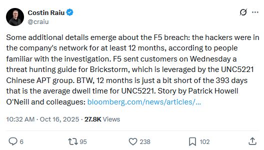 - The same Bloomberg article says F5 sent customers a guide on how to find and remove the Brickstorm malware.