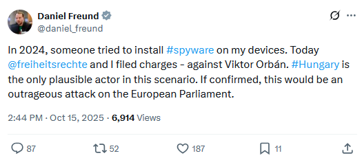 EU MEP files criminal complaint over hacking: A Member of the European Parliament has filed a criminal complaint against Hungary's Prime Minister Viktor Orban over an attempted hack. German Green MEP Daniel Freund claims the Hungarian Secret Service tried to deploy spyware on his device in May of last year. The incident was detected by the EU's cybersecurity team and linked to spyware developed by Israeli surveillance vendor Candiru. Freund has been one of Orban's biggest critics in the EU. [ Additional coverage in Politico Europe ]