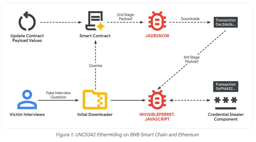 DPRK hackers adopt EtherHiding: North Korean state-sponsored hackers are using smart contracts to store portions of malicious code on the Binance public blockchain. The technique is called EtherHiding and has been previously used by multiple cybercrime and botnet operations since 2023. Google tracks the North Korean group as UNC5342 , but it is more widely known as Contagious Interview. The group is widely known for its massive cryptocurrency heists. The original group that developed and deployed EtherHiding in the wild is known as ClearFake, and Google also published a report on this group, which it tracks as UNC5142 .